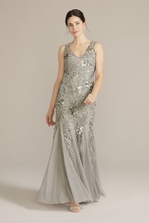 Dress in this deco-inspired gown for your next occasion and stun the crowd. Intricate beading shimmers through the fitted silhouette, while the flowy godet skirt adds extra volume and drama.