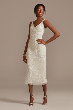This unique wedding dress comes in a midi length and is hand-beaded with a flower motif. A V-neckline and a low back create a flattering detail, while the mesh fabric and stretchy lining ensure that the bride is comfortable all evening long. Complete with a back slit for ease of movement when walking down the aisle or being a diva on the dance floor.