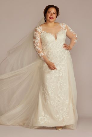 This beaded sheath wedding dress is brought to life with a removable overskirt. Illusion sleeves decorated with hand-placed lace appliques will enhance your bridal elegance alongside an open back detail.
