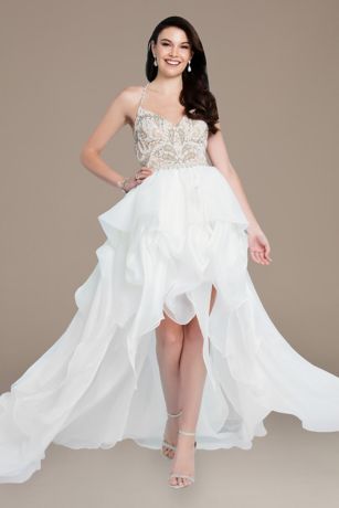 A beautifully beaded T-back bodice tops this stunning wedding dress, perfectly complementing the layered organza high-low skirt.