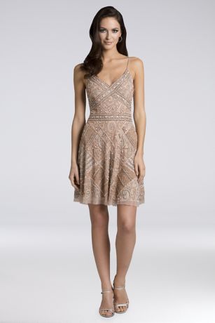 Topped with spaghetti straps and patchwork-style beading, this fun A-line dress is a must-have for any bridal event.