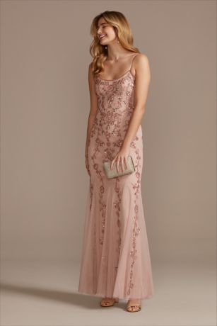 Beaded vines wind down this mesh scoopneck dress, creating brilliant texture atop the curve-hugging sheath silhouette. Dainty spaghetti straps and a godet hem complete the look.