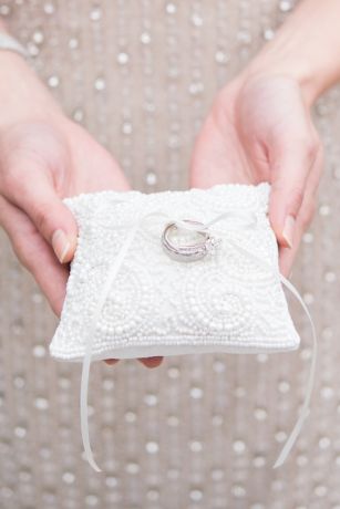 Crafted of raw silk, this hand-beaded pillow provides a soft, stylish place to display your rings on the big day. Complete with white satin ribbon to keep everything secure.