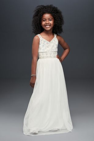 This beautiful flower girl A-line is crafted of tulle and finished with double straps and a beaded bodice.