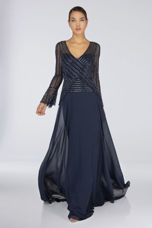 Bugle beads and sequins create an eye-catching geometric pattern atop this A-line dress, while sheer bell sleeves and a chiffon skirt complete the look.