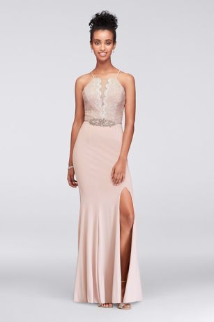 Beaded Waist Lace and Jersey Halter Sheath Gown