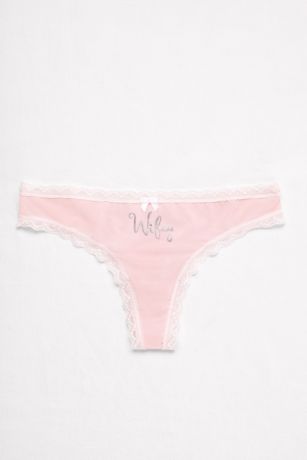 A cheeky addition to your honeymoon trousseau, this lace-trimmed thong sparkles with glitter "Wifey" lettering.