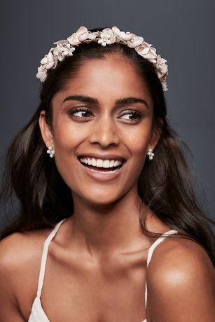 Soft pink petals, woven with gilded mesh, form a flexible headband to finish a wedding day 'do.