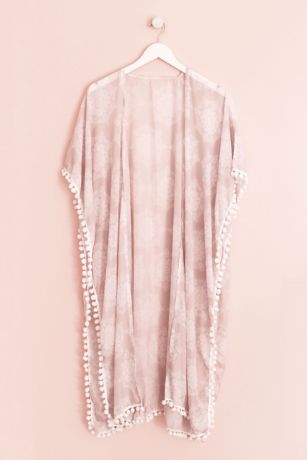Perfect for a bachelorette weekend getaway, this boho swimsuit coverup features pom-pom trim and "bride," bridesmaid," "maid of honor," or "matron of honor" in white script across the back.