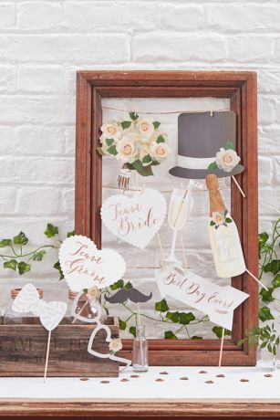 Create lasting memories with this elegant set of ten photo booth props. Includes champagne bottle, top hat, "Team Groom" sign, "Team Bride" sign, heart glasses, bouquet, champagne flute, moustache, bow tie, and "Best Day Ever" sign.