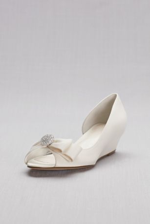 A classic pair of satin wedges, adorned with a crystal-centered bow.