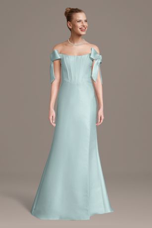 This mikado mermaid dress features a flattering silhouette and charming bow-shoulder detail, perfect for bridesmaids or special occasions.