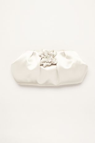 • Satin clutch features a fabric flower with iridescent beads at center.