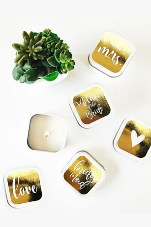 White square candle tins make a pretty and practical gift your bridal party will love! These candle tins come in a set of 12 - one for each member of your bridal party. You will receive 12 candles and a total of 24 labels in the foil color of your choice (12 extra so you can choose how many of each design you need for your bridal party). Candle Tins emit a subtle floral fragrance.