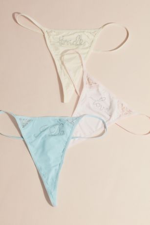 A sexy set of three fun thongs to take you through your wedding weekend and beyond, printed with "Love," "Bride," and "I do," in gold script.