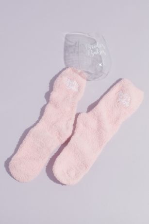 This bride's babes gift set for bridesmaids includes a stemless wine glass and a pair of fuzzy socks.