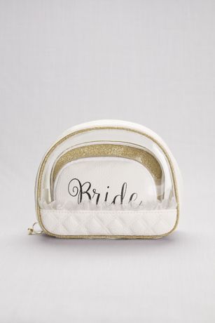 Organize all your big-day essentials in this set of three cosmetic bags. The large ruffled bag is perfect for toiletries, the medium-size glitter bag fits brushes and blushes, and the smallest bag features the word "bride" and is just the right size for jewelry and other tiny treasures.