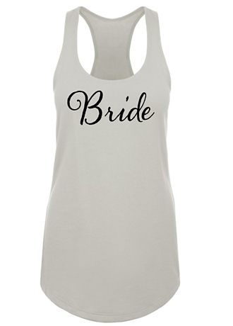 Our sleek flowy racerback tank features Bride in a gorgeous script font. This loose-fitting tank is available in dozens of colors and is printed in your choice of white or black.