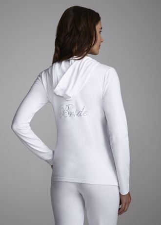 Compliment your engagement in style with this rhinestone hoodie jacket/sweatshirt.  This jacket is constructed of premium cotton spandex that is soft on the ski yet stretch for the perfect silhouette.  Bling ring is on the front of the hoodie and rhinestone Bride is featured on the back. Perfect for a Bachelorette Party!.