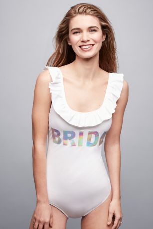 Ready to take the plunge? Prove it in this cute, ruffled swimsuit with "Bride" emblazoned on the front in hologram lettering, perfect for your bachelorette weekend.