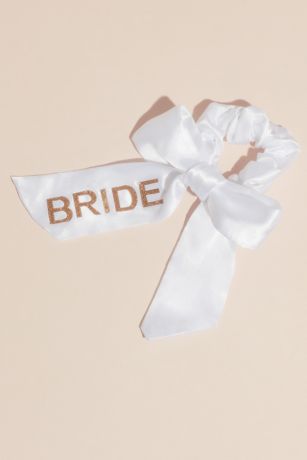 A cute hair accessory for pool-side at the bachelorette party or for getting ready, this white satin bow scrunchie is printed with Bride in gold foil.