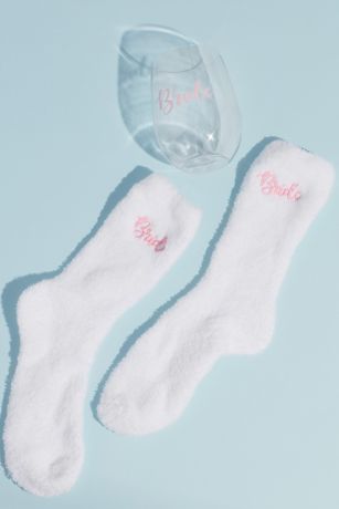 This bride gift set includes a stemless wine glass and a pair of fuzzy socks.