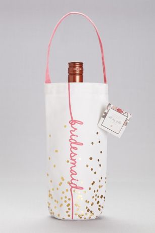 What better way to thank your bridesmaids than over a glass of wine? This printed canvas wine tote features her title in cursive script with a sprinkling of gold dots.