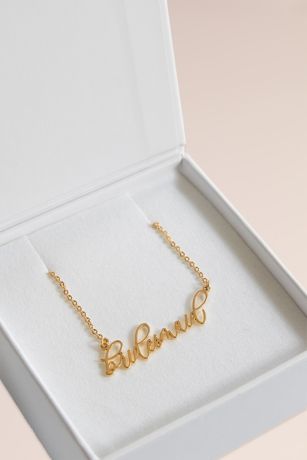 Delicate script spells out the word "bridesmaid" on this simply beautiful necklace. Present it as a gift on your wedding day or use it as a way to ask her to be one of your leading ladies.