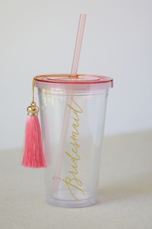 Adorned with a pretty pink tassel, this tumbler is printed with the word "bridesmaid" in gold foil.
