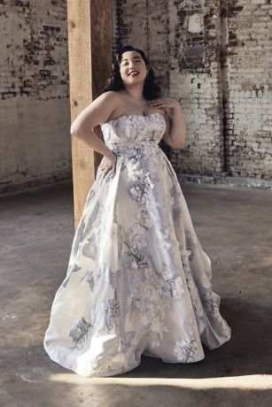 Make a grand entrance in this strapless brocade wedding dress dotted with beads and sequins from the straight neckline to the chapel train.