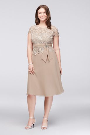 A pleated waistband with a dazzling brooch detail makes this cocktail-length illusion lace and chiffon plus-size dress even prettier.