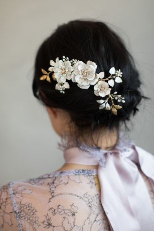 Swarovski crystals and freshwater pearls surround hand-enameled brass flowers on this lovely hair comb.