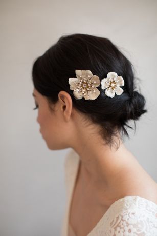 This set of two hand-enameled hair combs is detailed with delicate filigree and hand-set Swarovski crystals.