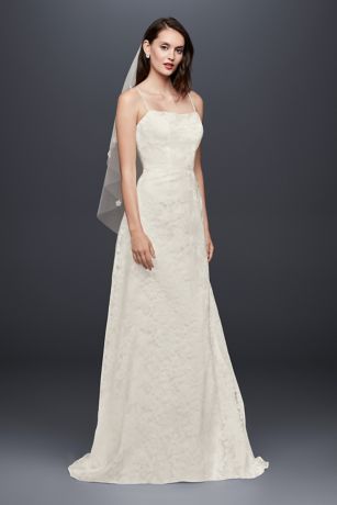 Wide-set spaghetti straps and a flattering crumb-catcher neckline give this A-line wedding gown a traditional touch, but the textured, burnout floral organza fabric makes a free-spirited impression. Finished with a lace-up detail and soft pleating at the scoop back.