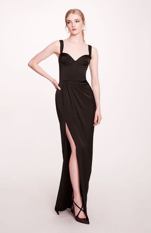 Sleek and sophisticated, this satin column dress gets a dose of drama from a bustier bodice and ruched detailing. A thigh-high slit adds to the statement-making effect.