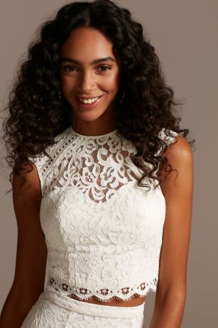 This lace cap sleeve wedding separates top features an illusion sweetheart neckline, scalloped eyelash trim, and an oh-so-romantic row of buttons down the back. Designed to be mixed and matched with our wedding separate skirts.