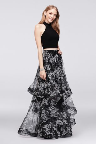 Layers of floral-printed mesh create the dramatic skirt of this two-piece ensemble, as the caged-back high-neck jersey top adds edge.