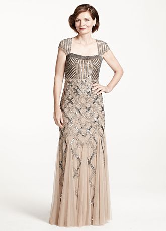 - Cap sleeve fully beaded gown with square neckline features eye-catching envelop open back.