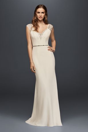 Cap Sleeve Beaded Crepe Sheath Wedding Dress