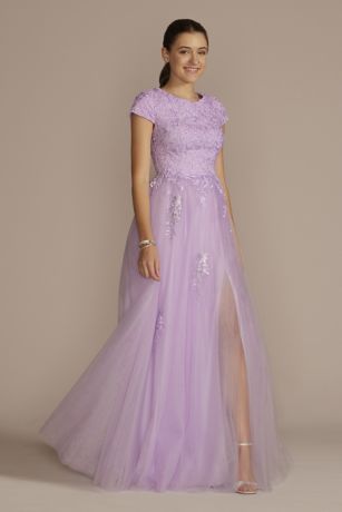 Set hearts aflutter this prom season with the most romantic combination, tulle topped with delicate embroidered lace applique. A modern take on a modest style, this ball gown features cap sleeves and an ethereal full skirt designed with a peek-a-boo slit.