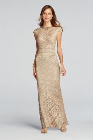 You'll be a stunning Mother of the Bride or Groom in this long and luxe jeweled illusion neckline dress!