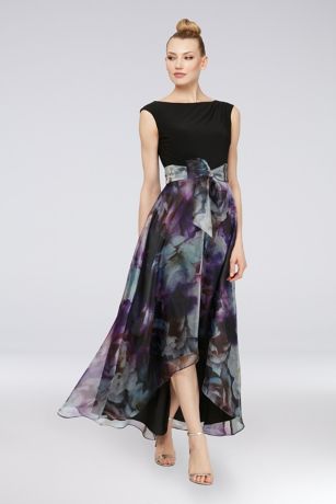 Cap Sleeve Jersey and Floral Organza High Low Gown