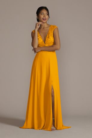 Ready to make a statement? This sexy bridesmaid dress is full of glam details including illusion cap sleeves, a plunging illusion bodice with sequins, a keyhole back, and a full georgette skirt with slit. Features side pockets.