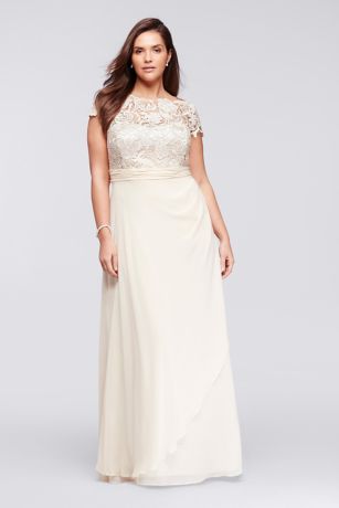 The illusion lace that graces the neckline of this floor-length dress appears to bloom across the bodice. An elegantly ruched skirt flows in a subtle cascade from the lace bodice.