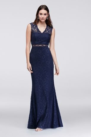 With the on-trend look of a two-piece ensemble, this lace mermaid dress, with illusion details at the cap sleeves and waistline, exudes modern elegance.