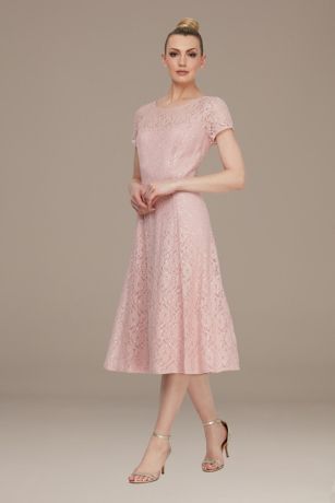 Crafted of dainty lace and topped with scattered sequins, this tea-length A-line dress is detailed with an illusion neckline and a keyhole back.