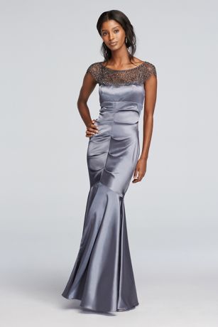 • Flared trumpet skirt adds drama and movement.