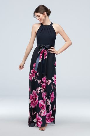 Rich floral blooms cascade down the skirt of this circle-neck chiffon gown. A tied satin bow at the waist adds a final touch of sophistication.