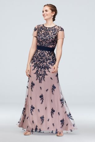 Petals, leaves, and vines cascade from the bodice to the hemline of this charming illusion short sleeve gown, cinched at the waist with a wide pleated waistband.