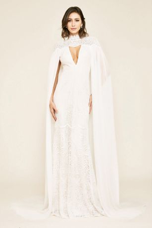 Heads will turn when you walk down the aisle in this statement-making lace wedding gown. A chiffon cape cascades over the shoulders, perfectly showcasing a plunging cutout neckline. Finished with an elegant sweep train.